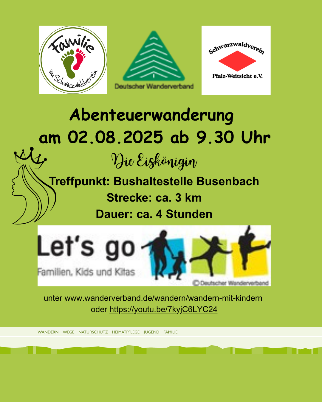Am 02.08.2025 gibt es wieder Abenteuer. Dieses Jahr treffen wir uns unter dem Mottel "Die Eiskönigin - " am 02.08.2025 um 9.30 Uhr an der Bushaltestelle Waldbronn-Busenbach (gegenüber von der S-Bahn-Haltestelle).