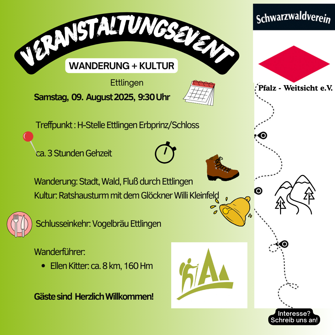 Kombination der Wandertour „Stadt, Wald, Fluss“ und danach in der Schlossapotheke und dem Ratshausturm nebst Führung mit dem Glöckner Willi Kleinfeld von Ettlingen. Die Wanderroute wurde zertifiziert durch wanderbares Deutschland. Die Tour führt durch die Ettlinger Altstadt aber auch bis zum Bismarckturm.