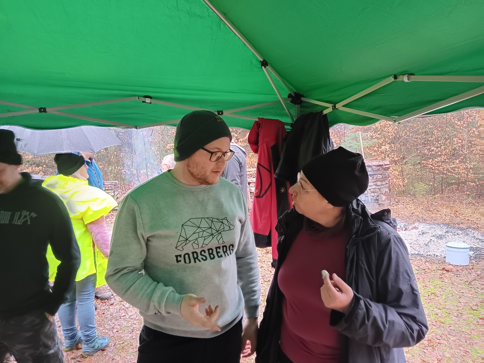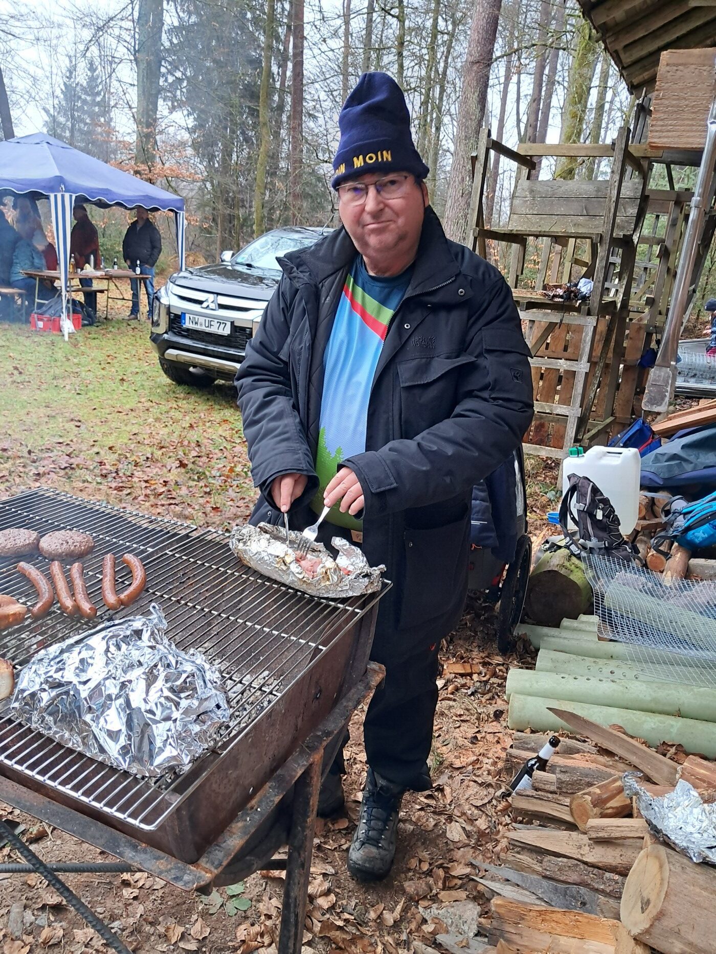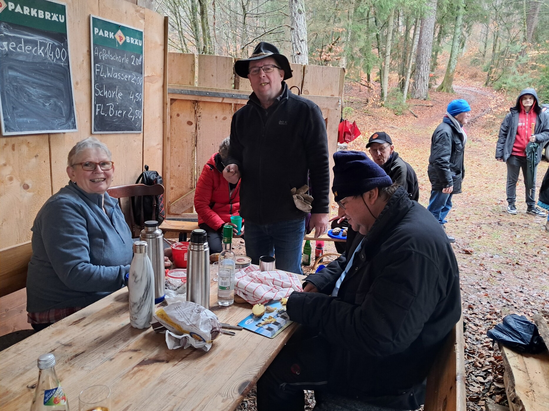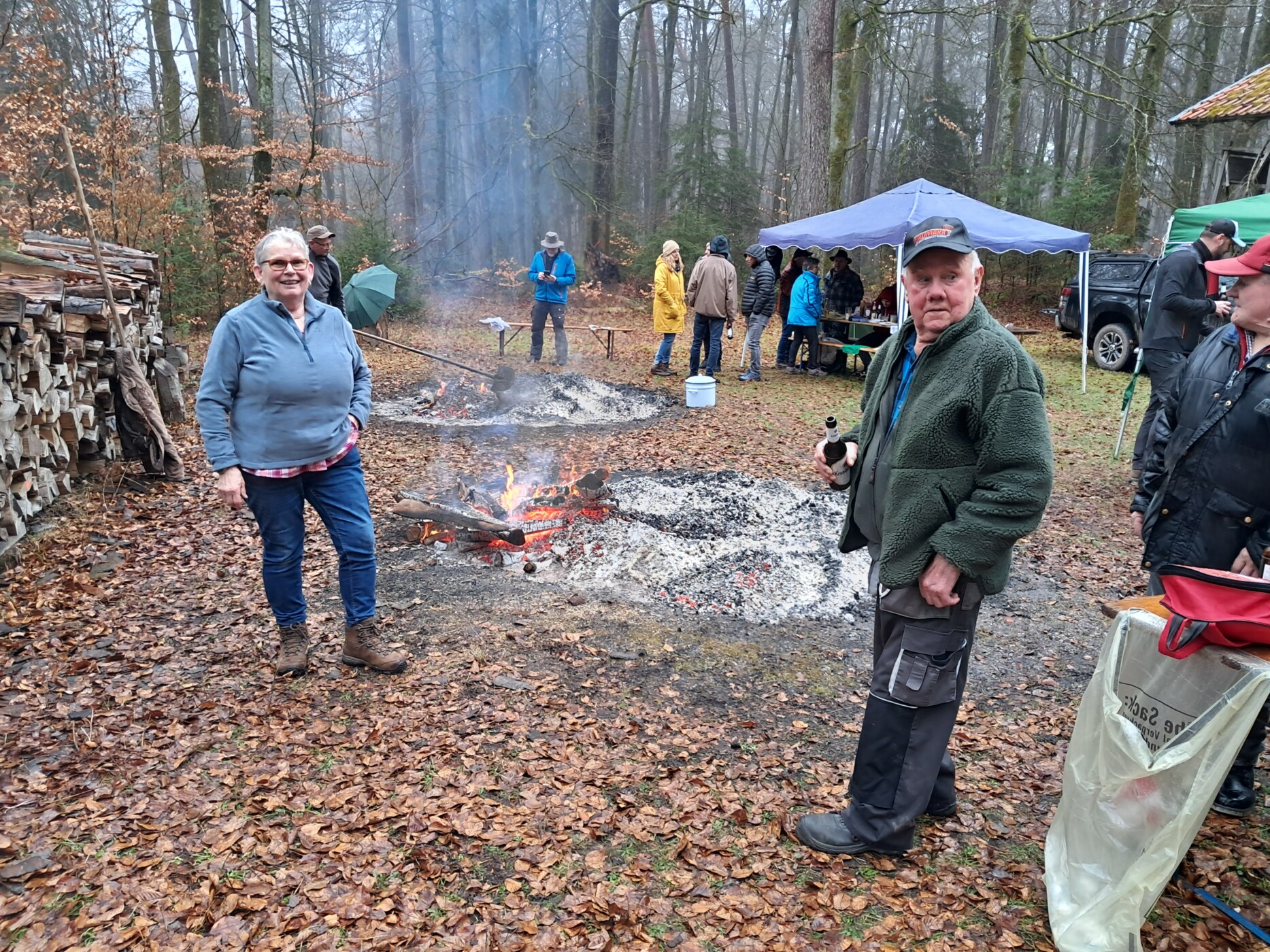 Am Samstag, den 21.02.2026 trafen sich die dem Regen trotzenden Wanderer des Schwarzwaldverein Pfalz – Weitsicht e.V.. Schon unser Treffpunkt am Tanzplatz in Iggelbach war eine logistische, aber letztlich doch schaffbare Herausforderung. Unsere Wanderführerin Ingrid Trippen führte den Schwarzwaldverein Pfalz – Weitsicht e.V. nicht nur auf einer Tour rund um Elmstein-Iggelbach, damit wir in unseren Mägen etwas Platz schaffen konnten. Wir waren zuvorderst auf dem Weg zu dem pfälzischen Heimatverein ihres Ehemanns Reinhold Trippen – dem Pfälzerwaldverein Iggelbach. Es wurde auch dieses Jahr wieder „Oigscherrtes“ mitten im Wald abgehalten. Aber was ist das? Es zuvorderst Gutes aus der Glut. Vor allem Pälzer Grumbeere. Also auf gut deutsch Kartoffeln. Was so große Anziehungskraft entwickelt, ist ein alter Waldarbeiterbrauch, der jährlich wiederbelebt wird. Der Abschluss unserer und vieler anderen Wanderungen ist an einem mit Buchenholzglut schon lange vorher gut vorbereiteten Grillplatz. Pälzer Grumbeere sind aber nur die Standardversorgung. Alle Beteiligten ließen sich Ideen einfallen, was in Alufolie verpackt in der Glut vergraben und gegart werden kann. Von Fleesch über Worschd bis hin zum Limburger – alles ist möglich. Der “Oischerr-Meister” berät hinsichtlich der Garzeiten. Ein Schweinefilet ummantelt mit Speck braucht bei drei Schichten Alufolie ca. 30 Minuten. Ein Ofenkäse ist nach 15 Minuten schon servierfertig. Quark zum Tunken der Kartoffeln ist auch heiß begehrt. Wenn ihr am Feuer steht, wird es mächtig warm. Die „Oischerr-Meinster“ haben einen wirklich heißen Job. Auch wir wurden durstig, wenn wir am Feuer standen und auf unser Grillgut warteten oder aus dem Kessel eine rußige Pälzer Grumbeer entnahmen. Das Warten wurde mit anregenden Gesprächen verkürzt. Beispielsweise haben wir Marc Hegen kennen gelernt. Er ist nicht nur im Vollzeitjob, in der Weiterbildung, im Gemeinderat Elmstein, in der örtlichen Feuerwehr, als DJ bei der Kerwe, beim Fasching sondern auch beim PWV Iggelbach aktiv. Für das Ehrenamt gibt es wahrlich Hoffnung. Ganz besonderer Dank wollen wir auch hier dem 1.Vorsitzenden Jürgen Ruf und seiner Mannschaft vom PWV Iggelbach aussprechen. Unser Rat, wenn ihr auch mal bei den „Oigscherrte“ dabei sein wollt. Erstens: Es ist Winter. Da macht ein warmes Getränk in der Thermoskanne auf alle Fälle Sinn. Wer ein Kaltgetränk mag, der wird vom PWV Iggelbach aber auch bestens versorgt. Bei der Kleidung bitte drauf achten, dass es eher die zweite Garnitur ist. Für Funkenflug wird schließlich keine Haftung übernommen. Besteck und Holzbrett hilft beim Verzehr ungemein. Vergesst die Spende nicht, denn das Buchenholz und die Kartoffeln müssen von den Veranstaltern bezahlt werden. Wir hatten auf alle Fälle viel Spaß und Freude am Geschehen, an den Leuten und der ganzen Veranstaltung.